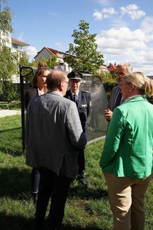 v. l. n. r.: Stefanie Hennig (AMS KJH AMBOS), Bürgermeister Jürgen Opitz, Polizeipräsident Lutz Rodig, Innenminister Armin Schuster und Sandra Gockel (MdL, bildungspolitische Sprecherin CDU-Fraktion) beim Rundgang im Außengelände des MeGAH.