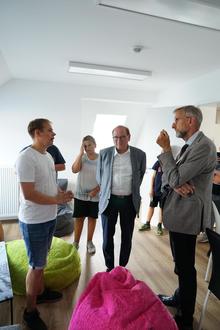 Mike Strohbach (Jugendbeirat Heidenau) im Gespräch mit Bürgermeister Jürgen Opitz und Innenminister Armin Schuster (v. l. n. r.)