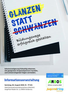 Alle interessierten und/oder betroffenen Familien lädt die Arbeitsgruppe Schulabsentismus am 26. August 2023 von 15 bis 17 Uhr ins MehrGenerationenAktionsHaus (MeGAH) auf der Siegfried-Rädel-Straße 5 zu einer unverbindlichen Informationsveranstaltung ein.