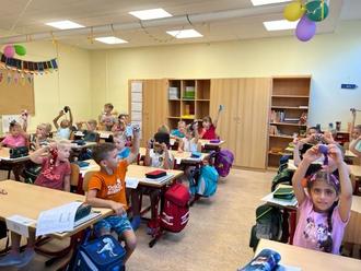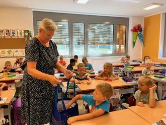 – unsere Schulanfängerkinder bekamen am Donnerstag in ihrer ersten Schulwoche lieben Besuch. Frau Rähme vom Handarbeitstreff im Bürgerzentrum am Gumpi hat mit vielen fleißigen Helfern kleine Mäuse für alle neuen Schulkinder gebastelt. Jedes Kind konnte sich eine Maus aus dem Beutel nehmen.