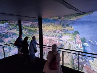 Eingebettet in das Elbtal hat die Stadtlandschaft mit Meißen im Norden und Pillnitz im Süden schon früh Vergleiche mit Florenz nach sich gezogen, die Dresden den Beinamen „Elbflorenz“ einbrachten. Im Panorama ist die Szenerie gefüllt mit dem pulsierenden Leben der Zeit. Szenen mit historisch belegten Personen wie Zar Peter I., Johann Sebastian Bach oder Casanova befeuern den „Geruch der Zeit“, Sänftenträger auf den Gassen, Marktfrauen in ihren Ständen oder Possenreißer auf den Plätzen machen den Alltag erlebbar. Die Troisdorfer begegneten am unteren Bildrand an der Augustusbrücke dem Hofnarren Fröhlich, der uns letztes Jahr durch Dresdens Zentrum führte. Es war ein unvergessliches Erlebnis für uns. Anschließend stand uns der Rest des Tages zur individuellen Nutzung zur Verfügung.