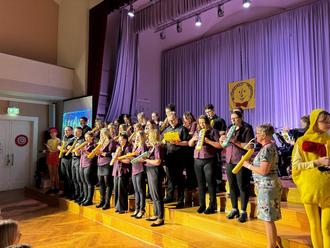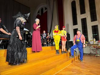 Die Lacher und einen kräftigen Applaus hatten auch die beliebte Hexe Notenschreck und ihr Hausi (Sabine und Hartmut Tomuschat) auf ihrer Seite, als sie als Jubiläumsgäste auf der Bühne erschienen. Von all dem konnte sich Monika Schuster beim Dirigieren nicht ablenken lassen. „Auch wenn ich gefühlt jederzeit mit noch einer Überraschung gerechnet hatte – meine Truppe hatte da ja wieder so einiges vorbereitet – waren es zwar anstrengende vier Konzerte an den beiden Tagen, aber ich bin sehr, sehr glücklich.“.