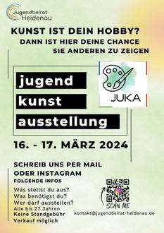 Jugendliche und junge Heranwachsende erhalten die Möglichkeit, ihre eigenen Kunstwerke in einer Ausstellung zu präsentieren und zu verkaufen. Neben diesem Angebot besteht Möglichkeit, verschiedene Workshops von Künstlern zu unterschiedlichen künstlerischen Themen zu besuchen. Dieses Workshop Angebot kann von allen Besuchern und Austellern der JUKA genutzt werden.