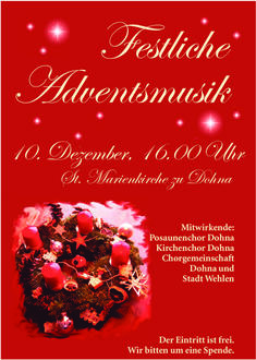 Der „Chorus 116“ mit dem Philharmonischen Kammerorchester unter der Leitung von Wolfgang Hentrich wird in der St. Marienkirche zu Dohna die Kantaten 1-3 des Weihnachtsoratoriums von J. S. Bach aufführen.