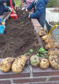 Die größte Überraschung aber verbarg sich tief unter der Erde: Beim Lockern des Bodens stießen die fleißigen Hände auf einige vergessene Kartoffeln. Der Fund löste große Begeisterung aus und sorgte für strahlende Gesichter bei den kleinen Hobbygärtnern. Die Knollen wurden stolz präsentiert und die Kinder diskutierten eifrig darüber, was man wohl alles daraus machen könnte.