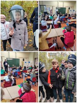 In zwei vierten Klassen durften wir im Rahmen des Vorlesetages drei Bundespolizisten begrüßen. Sie besuchten an diesem Tag verschiedene Schulen. Im Klassenzimmer hörten wir die Geschichte von Max und Fabi, die gemeinsam mit der Bundespolizei einen Diebstahl aufklären. Im gemeinsamen Gespräch diskutierten wir über die genannten Themen. Als weiteres Highlight durften wir uns den Polizeiwagen ansehen, Hut, Helm und schusssichere Weste anprobieren. Die waren vielleicht schwer. Wir danken den Polizisten für ihr Engagement und die schöne Stunde, die sie uns bereitet haben. Im Polizeigeschichtenbuch werden wir oft lesen.