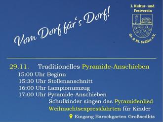 Ab 15:00 Uhr erwartet die Gäste vor dem Eingangstor am Barockgarten ein stimmungsvolles Programm: Festliche Stände mit weihnachtlichen Leckereien, Glühwein und großer Stollenanschnitt, der Weihnachtsexpress fährt und ein Lampionumzug für die Kinder ist organisiert. Höhepunkt des Abends ist das feierliche Anschieben der Großsedlitzer Pyramide und das gemeinsame Singen des Pyramidenliedes – ein Brauch, der Jahr für Jahr zahlreiche Besucher in die Ortschaft lockt.