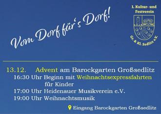 Alle Anwohner, Heidenauer sowie deren Gäste sind herzlich eingeladen, die besinnliche Adventszeit gemeinsam in Großsedlitz einzuläuten.