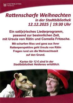 Am Freitag, dem 12.12.2025, laden wir herzlich ein zu unserer Abendveranstaltung „Rattenscharfe Weihnachten“. Karten á 12,-€ sind ab sofort im Vorverkauf in der Bibliothek erhältlich.