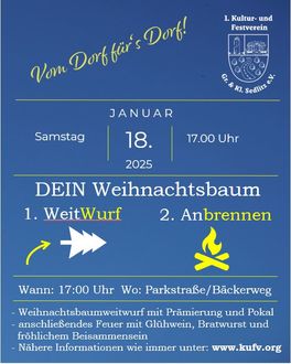 Der Treffpunkt ist um 17:00 Uhr auf der Wiese an der Parkstraße/Bäckerweg. Sie erkennen es an unserer Weihnachtsbude, die dann u.a. Bratwurst und Glühwein für Sie bereithält. Sie bringen bitte Ihre abgeschmückten Weihnachtsbäume und ein für die Jahreszeit angemessenes Schuhwerk für eine verschneite oder feuchte Wiese mit. Empfehlenswert sind auch ein Paar Handschuhe als Schutz und für den perfekten Wurf.