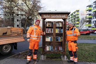 Der Bücher-Tauschschrank in Mügeln nach der Reparatur durch die Mitarbeiter des städtischen Bauhofes.