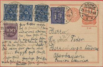 alte Postkarte (Ganzsache) von 1923 aus der Zeit der Inflation, Stempel Dohna bei Heidenau