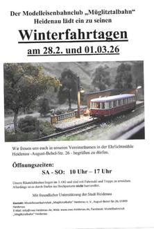 Es ist wieder soweit. Der MEC Heidenau lädt am 28.02. und 01.03. 2026, jeweils 10-17 Uhr zu seinen Winterfahrtagen ein. Zu sehen werden unsere Clubanlagen der Spuren N-TT und 0 sein. Zusätzlich sind noch 3 Winteranlagen zu bestaunen. Für unsere jüngsten Besucher ist die Spieleanlage wiederaufgebaut. Daran können die kleinen Lokführer die Züge selbst fahren lassen.