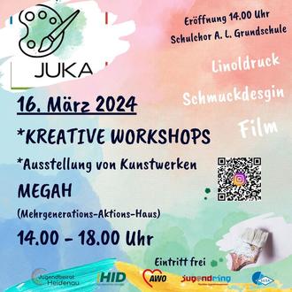 Von 14:00 bis 18:00 Uhr könnt ihr die ausgestellten Kunstwerke besichtigen und käuflich erwerben oder auch an verschiedenen Workshops teilnehmen. Eröffnet wird die Ausstellung um 14:00 Uhr mit einem Programm des Schulchors der Astrid-Lindgren-Grundschule. Anschließend erwarten euch kreative Workshops wie z.B. ein Filmkurs, kreatives Schmuckdesign, Linoldruck oder ein Scherenschnittkurs. Schaut einfach mal vorbei – wir freuen uns auf euch!