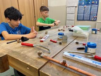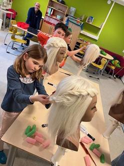 Mit viel Freude stellten uns die Handwerker an fünf Stationen ihre Berufe vor. Beim Friseur konnten wir Frisuren gestalten, eine Flechttechnik kennenlernen und Lockenwickler eindrehen. An der Station des Elektrohandwerks entstand ein Windrad aus Holz mit solarbetriebenen Flügeln. Mit verschiedenen Techniken ging es an der Station Sanitär-Heizung-Klima (SHK) weiter. Aus Kupferrohren entstand zur Erinnerung ein Kerzenständer. Dabei mussten wir Verbindungen schaffen und löten. Beim Tischler haben wir eine Grillzange angefertigt und der Metallbauer brachte Teile für eine Sparbüchse mit, die wir zusammenbauen mussten.