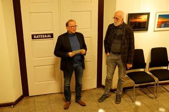 Bürgermeister Jürgen Opitz mit Andreas Meschke während der Ausstellungseröffnung im Heidenauer Rathaus
