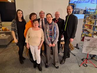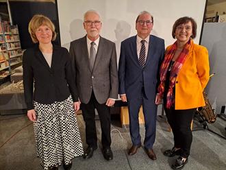 Die Vortragenden des Abends: Pfarrerin Erdmute Gustke, Bürgermeister a.D. Michael Jacobs, Bürgermeister Jürgen Opitz und Bibliotheksleiterin Petra Hänel