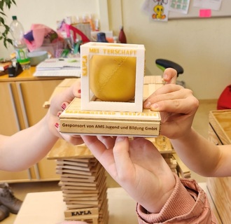 Schließlich mussten die Baumeister gemeinsame Ideen besprechen, Aufgaben im Team verteilen und gemeinsam auf engem Raum Häuser und Brücken bauen.