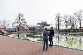 Erste Beigeordnete Marion Franz und Badleiter Marko Paeslack im winterlichen Albert-Schwarz-Bad