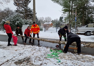 Die Männer vom Dorf mit dem frischgefällten Maibaum.