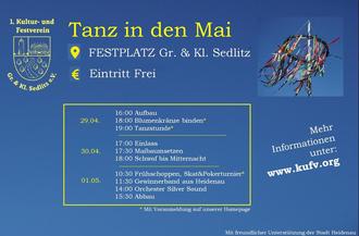 Der 1. Kultur- und Festverein Gr. & Kl. Sedlitz e.V. gibt das offizielle Programm zum "Tanz in den Mai 2024" bekannt. In diesem Jahr ist der 1. Mai mitten in der Woche und daher werden die Festlichkeiten über 3 Tage zelebriert.
