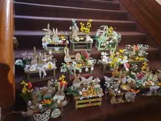 Unsere Bastelergebnisse können sich sehen lassen: individuell gestaltete Bänke mit wunderschöner Osterdekoration entstanden beim diesjährigen Osterbasteln.