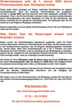 Ab dem 1. Januar 2024 wird das Dokument nicht mehr ausgestellt, verlängert oder aktualisiert. Eltern, die mit ihren Kindern verreisen wollen, brauchen künftig entweder einen Personalausweis oder einen Reisepass mit Chip für den Nachwuchs. Bei Reisen innerhalb der EU genügt ein Personalausweis. Für Reiseziele über die EU hinaus ist in der Regel ein Reisepass erforderlich.