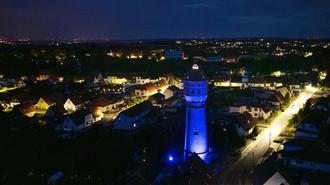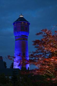 Der Wasserturm ist mit 31 Metern Höhe auch ohne Lichteffekte normalerweise nicht zu übersehen. Seit 2011 ist er als Wasserspeicher mit einer 100 Kubikmeter fassenden Wasserkammer schon außer Betrieb. Doch unbedeutend für die Versorgung der Kunden mit Trinkwasser ist er deshalb nicht: Im Erdgeschoss ist inzwischen eine Druckerhöhungsanlage eingebaut.