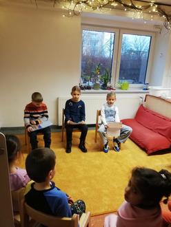 Nachdem gemeinsam ein Weihnachtslied gesungen wurde, wartete heute eine ganz besondere Überraschung auf die Kinder. Nämlich, dass ehemalige Kita- Kinder eine Weihnachtsgeschichte vorlesen kommen.