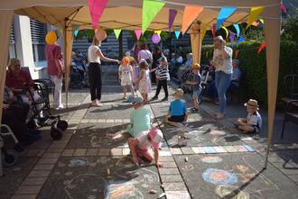 Kitakinder gestalten Straßenmalfest für Pflegeheimbewohnende, Tagespflegegäste und Mieter des Betreuten Wohnens des Seniorenzentrums „Albert Schweitzer“