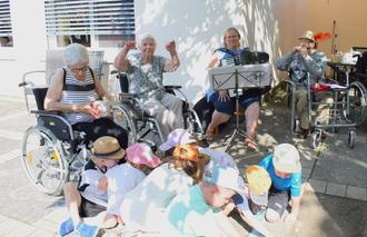 Für die musikalische Begleitung des Festes sorgte die Erzieherin, Antje, mit ihrem Akkordeon und ein Mieter des Betreuten Wohnens, Herr Wegmann, mit seiner Mundharmonika. So konnten alle bei kühlen Getränken und leckerem Eis bekannte Volks-, Stimmungs- und Kinderlieder lauschen.