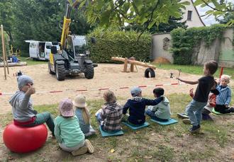 Mit Zollstock, Säge, Hammer, Meißel sowie einem brummenden Radlader reisten die Monteure an und bauten die lang ersehnte Wippe auf. Begeistert schauten die Kinder zu. Sie waren es nämlich, die mitteilten, dass ihnen genau ein solch tolles Spielgerät noch fehlte.