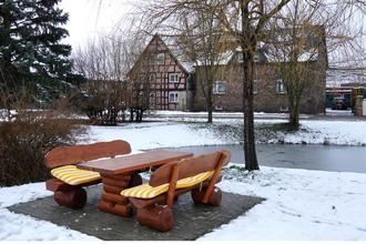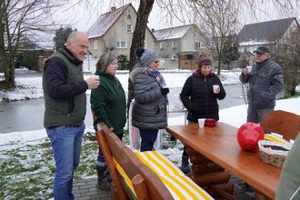 Pünktlich an Heiligabend wurde sie geliefert, die neue Sitzgruppe am Züllsdorfer Teich. Am Vormittag wurde noch eifrig ab- und aufgeräumt, um den neuen Bänken Platz zu machen, welche so noch am selben Tage ihr neues Zuhause beziehen konnten. Ein ganz besonderes Fleckchen, hat es doch eine eigene Hausnummer – ganz ohne Haus. Und so erstrahlt die Hauptstraße 25 seit Weihnachten in neuem Glanz: Idyllisch am Teich gelegen, lädt die neue Sitzgruppe Einwohner und Besucher zum Verweilen ein.