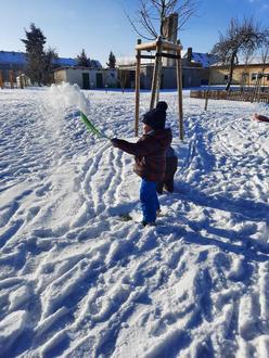 Auch waren unsere Kita-Kinder „außer Rand und Band“: leuchtende Augen sahen den Schneeflocken beim Herabfallen zu. Die eisige Kälte und der Schnee haben uns mit allen Sinnen experimentieren lassen. Ob wir den Schnee in unsere Räume geholt haben oder Wasser mit Naturmaterialien in einem Behälter über Nacht in den Garten stellten, es gab viel zu erforschen. Staunend wurde das gefrorene Wasser mit den Materialien angeschaut und mit den Händen erfühlt. Unser Rodelberg hat, wie jedes Jahr, unsere Kita-Kinder zum freudigen Schlitten fahren eingeladen.