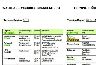 Die zweitägigen Veranstaltungen finden jeweils am Freitag von 16.00 bis 19.30 Uhr und am Sonnabend von 8.30 bis 15.30 Uhr statt, Teilnahmebetrag 45 €. Eine Übersicht über alle Termine und Orte finden Sie unter www.waldbauernschule-brandenburg.de.