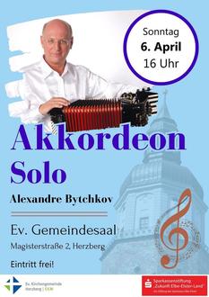 Die Evangelische Kirchengemeinde in Herzberg lädt herzlich zu einem besonderen Hörerlebnis ein: Das Akkordeon-Solokonzert „Akkordeon Total! – Musikalische Reise von J. S. Bach bis A. Piazzolla“ mit dem Akkordeon-Virtuosen Alexandre Bytchkov findet am Sonntag, den 6. April 2025 um 16 Uhr im Evangelischen Gemeindesaal, Magisterstraße 2 statt.