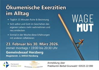 Wer hat Lust, für 30 Minuten täglich dem Alltag zu entfliehen, zur Ruhe zu kommen, sich zu besinnen und ein wenig zu sich selbst zu finden? Machen Sie mit und lernen Sie die „Exerzitien“ kennen, eine Form der geistlichen Übung. Fünf Wochen lang können Sie Ihren Sehnsüchten und Realitäten bewusst nachspüren, erkennen, was unser Leben reich macht, und sich anhand von Liedern, Texten und Meditationen neu entdecken. Einmal in der Woche treffen wir uns als Gruppe im Gemeindehaus zum gemeinsamen Austausch. Gönnen Sie sich Zeit für sich und für Spiritualität!