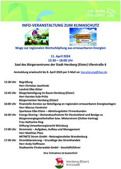 Am 11. April 2024 findet in Herzberg (Elster) im Bürgerzentrum eine Informationsveranstaltung statt, die sich dem Thema „Wege zur regionalen Wertschöpfung aus erneuerbaren Energien“ widmet.