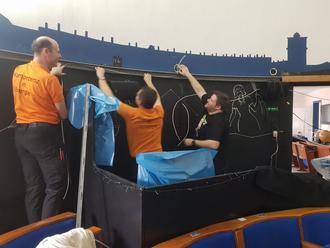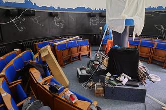 Das Resultat der Mühe: die Planetariumskuppel ist nun mit einer umlaufenden indirekten LED-Beleuchtung versehen, die den Innenraum warm, augenschonend und gleichmäßig ausleuchtet. Zusätzlich gelang es, einen Großteil der alten Elektrik auszubauen. Viele Kabelkanäle, die vorher für eine unruhige Wandgestaltung sorgten, sind abmontiert und gehören der Vergangenheit an.