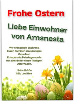 Am 19. April findet ab 18 Uhr findet das Osterfeuer am Rodelberg statt. Annahme ab 10 Uhr durch die Feuerwehr Arnsnesta. Für das leibliche Wohl sorgt ebenfalsl die Feuerwehr Arnsnesta.