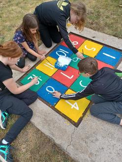 In der Woche vom 22. - 26. Mai war es aber endlich soweit – die vielen Ideen der Kinder konnten umgesetzt werden. Bei strahlendem Sonnenschein pinselten die Kinder „Himmel und Hölle“, ein Labyrinth, eine Sonnenuhr und viele weitere kreative Spiele zum Ausprobieren und Aktivwerden für Groß und Klein auf die alte Kegelbahn. Alle hatten sichtlich Spaß und verwandelten die graue Betonfläche in eine kunterbunte neue Spiel-Möglichkeit. Natürlich wurde die Fläche auch gleich ausprobiert und ist schon jetzt sehr beliebt bei den Kindern! Zum Abschluss des Projektes und zur Einweihung der Spiele freuten sich alle über leckere Pizza. Ein Ausflug zum Spielplatz in Mahdel lohnt sich nun noch einmal mehr!