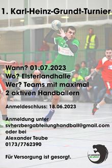 Du wolltest schon immer Handball spielen aber hast dich nicht getraut? Kein Problem! Zu unserem 1. Karl-Heinz-Grundt-Turnier am 01.07.2023 kannst du mit deinen Freunden am Turnier teilnehmen. In unseren Trainingseinheiten am 09.06., 16.06., 23.06. und am 30.06.2023, jeweils von 19.30 bis 21.00 Uhr, kannst du unter Anleitung die Grundlagen des Handballspielens lernen. Treff ist in der Elsterlandhalle. Wie du dich anmeldest, entnimmst du der Einladung. Die Teilnahme ist kostenlos.