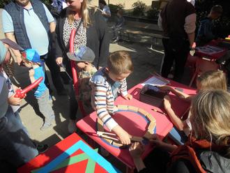 Eine ganz besondere Überraschung stand gleich am Eingang. Das maker Mobil der Stadt Herzberg mit Vanessa und Jule lud die Kinder zu tollen Aktivitäten ein. So konnten sich die Kinder im Bereich Technik mit dem 3 D Drucker kleine Stäbe für Seifenblasen herstellen und die Seifenblasen lustig über die Wiese flattern lassen. Auch die Fädelfiguren waren bei den Kindern sehr beliebt.
