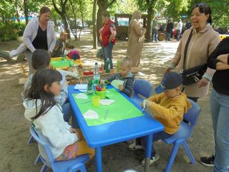 Im Bereich Mathematik hatten die Erzieher viele interessante Stationen aufgebaut, die die Kinder anregten, sich auszuprobieren, selbst Erfahrungen zu sammeln und Kompetenzen zu entwickeln. So konnten die Kinder mit großen Bausteinen nach Vorlage Figuren bauen, mit einer Zange Dinge greifen und Muster legen. Auf einer Magnetstraße konnten sie Autos fahren lassen und waren fasziniert, was Magnete bewirken. In einem Experiment stellten sich die Kinder aus Filtertüten bunte Blumen her. Sie staunten, wie sich die Farben durch Zugabe von Wasser vermischen. Beim Eierlauf kam es darauf an, den Löffel nicht zu schräg zu halten, um das Herunterkullern des Eis zu verhindern. Nachdem die Kinder dies erkannt hatten, trauten sie sich auch zu, über Schrägen zu laufen.