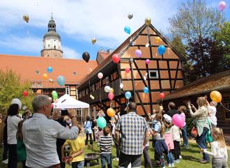 Nach der Aufführung waren alle zu einem Familienvormittag mit Brunch, Spiel- und Bastelangeboten eingeladen. Zum Abschluss standen die persönlichen Wünsche der Kinder und Jugendlichen im Mittelpunkt: Auf kleinen Kärtchen notiert und an Ballons befestigt stiegen sie alle gemeinsam in den Himmel und boten einen wunderbar bunten Anblick. Danach machten sich die Berliner auf den Heimweg. Wir bedanken uns für den tollen Besuch und freuen uns schon auf ein Wiedersehen, das fest geplant ist!