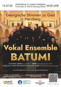 Am Sonntag, 13. Juli 2025, um 18 Uhr ist das georgische Vokal Ensemble Batumi mit einem außergewöhnlichen Konzert in der Stadtkirche St. Marien in Herzberg zu Gast. Seit über 30 Jahren begeistert das Ensemble weltweit mit mitreißenden Interpretationen georgischer Volkslieder und klassischer Werke. In Herzberg präsentiert BATUMI ein facettenreiches Repertoire polyphoner Gesänge – einer einzigartigen Vokalkunst, die von der UNESCO als immaterielles Weltkulturerbe anerkannt ist.
