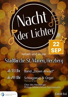 Ab 18 Uhr lädt die Band „Down Ahead“ auf dem Platz zwischen Kirche und Rathaus zum Verweilen ein. Mit Einbruch der Dämmerung erstrahlt dann das Innere der Kirche in farbigem Licht. In dieser besonderen Atmosphäre können die Gäste ab 20 Uhr den Klängen von Schlagzeug (Thomas Noetzel) und Orgel (Gerhard Noetzel) lauschen. Als weiteres Highlight tritt der Chor des Herzberger Philipp-Melanchthon-Gymnasiums mit bekannten Klassikern aus Rock und Pop auf.