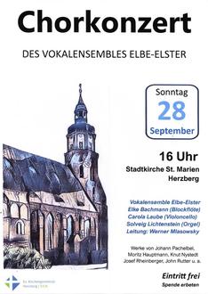 Das Vokalensemble des Elbe-Elster-Kreises musiziert Motetten für gemischten Chor und für Männerchor von Johann Pachelbel, Moritz Hauptmann, Josef Rheinberger, John Rutter und anderen Komponisten, eine Sonate für Blockflöte, Violoncello und Continuo sowie Orgelmusik (Elke Bachmann, Carola Laube und Solveig Lichtenstein). Die Leitung hat Kirchenmusiker Werner Mlasowsky.