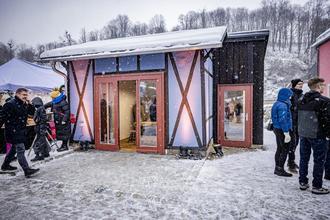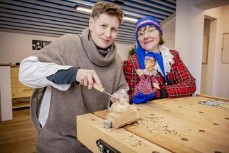 Aus diesem Stück Holz wird einmal ein Hohnsteiner Kasper. Das Foto zeigt Schnitzerin Elisabeth Trobisch und Heike Krause vom Traditionsverein mit einem Kasper am 3. Dezember 2023 in der neuen Schauwerkstatt. Nach zweieinhalb Jahren Planungs- und Bauzeit wurde die Schnitzbude zum 20. Hohnsteiner Weihnachtsmarkt eröffnet. Damit können nun in Hohnstein wieder die Kasperpuppen der Kasperfamilie geschnitzt werden. Die alte Tradition wird im ehemaligen Gewandhaus der Hohnsteiner Blasmusik wiederbelebt. Elisabeth Trobisch aus Hohnstein wird das Handwerk wieder aufnehmen und die Tradition der Schnitzerfamilie Berger fortführen. Der Umbau des Gebäudes kostete 200.000 Euro, wovon 80 Prozent aus GRW-Fördermitteln finanziert wurde.
