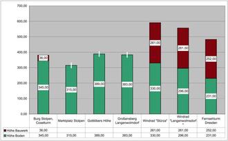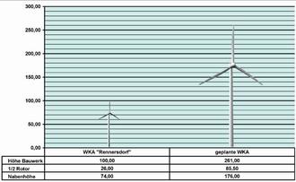 In Stolpen gibt es bereits Windräder in Langenwolmsdorf und natürlich in Rennersdorf. Die Grafik anbei zeigt die 100 Meter hohen Windräder, die dort aktuell stehen. Die Technik hat sich weiterentwickelt. Nunmehr sind die Windkraftanlagen bis zu 261 Meter hoch.